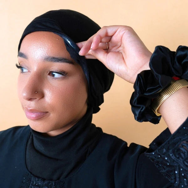 This detail changes everything. It keeps your underscarf perfectly in place from morning to night. The mulberry silk stays in full contact with your hair, so it stays protected at all times, even when you move or adjust your hijab.